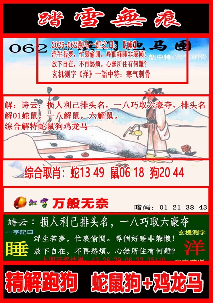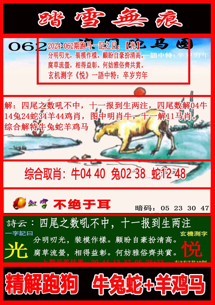 2026-062期正版彩图挂:06;挂牌:养家糊口;六肖:龙鸡虎马猴羊;火烧:兔